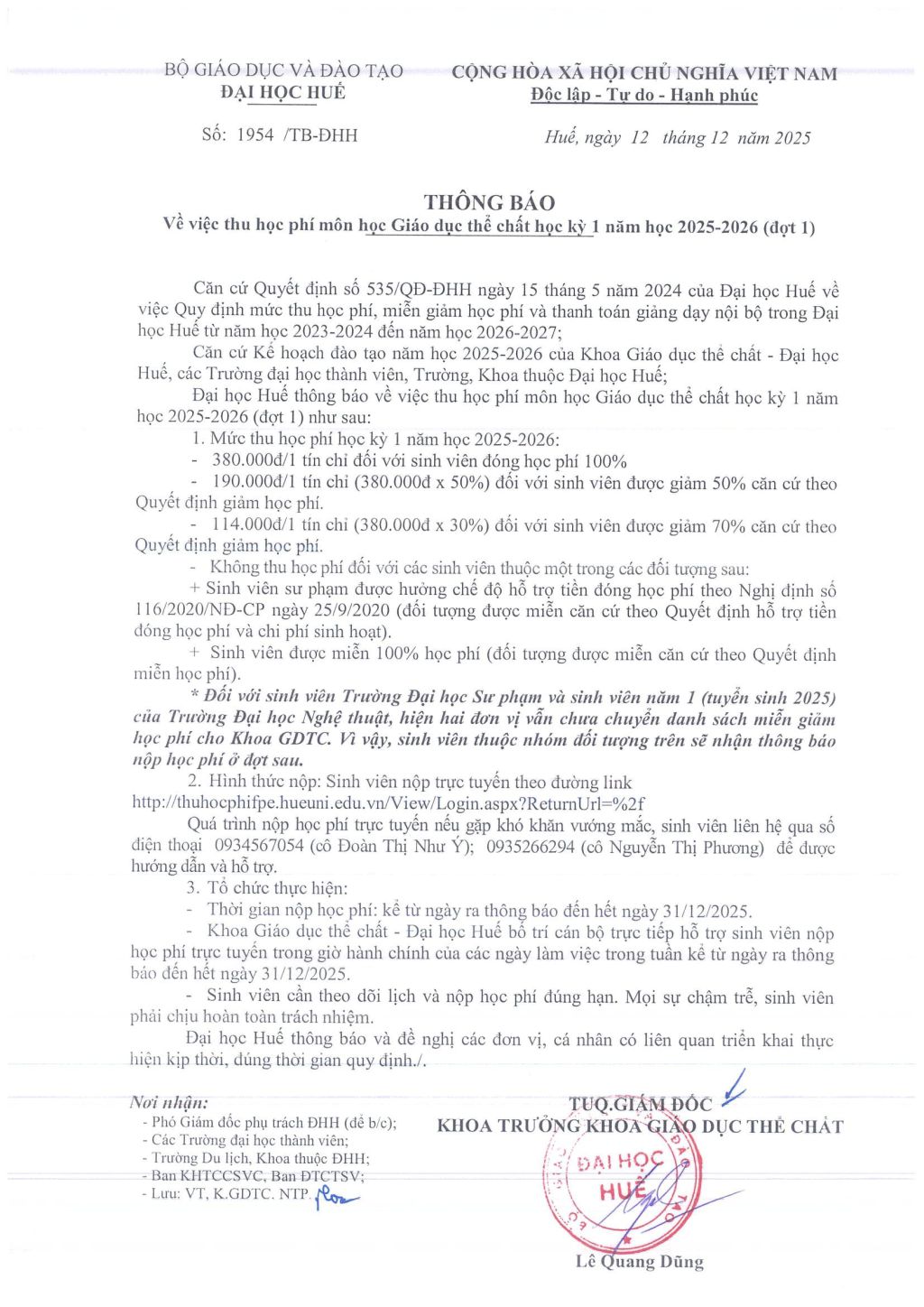 Thông báo thu học phí môn học Giáo dục thể chất học kỳ I, năm học 2025 - 2026 (đợt 1) (18-12-2025)